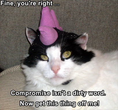 One of my rules in life is not to capitulate when someone bullies me as it tends to encourage them to continue acting like an … uh … annoyance. Always getting your way is not realistic by any stretch of the imagination unless you happen to be on a planet with a population of one. And we’re about 7 billion past that. Compromise is thus necessary (and it’s not evil, cross my heart).