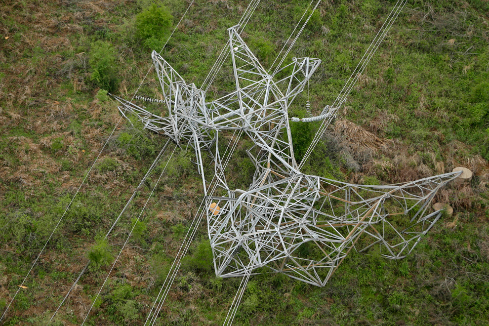 A twisted power distribution line tower is crumpled on the ground near Mayflower after a tornado struck the town late Sunday. Image by Danny Johnston/AP.