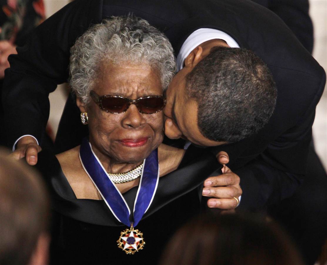 President Barack Obama kisses author and poet Maya Angelou after awarding her the 2010 Medal of Freedom during a ceremony in the East Room of the White House in Washington on Feb. 15, 2011.