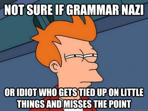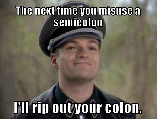 You have to laugh every once in a while to maintain some sense of sanity, reality and perspective. Not everything should be taken so seriously. War, rape, famine, death, etc.—yes, take those things very seriously because they can have a huge impact on our lives. But when you can’t laugh at something as utterly ridiculous as real grammar Nazis, something’s wrong. Most of the time, grammar only affects your blood pressure (have I mentioned how much I hate misuse of semicolons?), not your life.