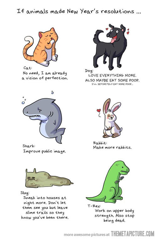 The pet resolutions are so accurate. My dog resolves to eat more cat litter and cat poop. I never should have switched to the organic walnut litter. Josie thinks it’s a snack.