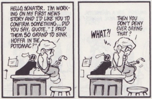 How a quote is framed can sometimes make all the difference in how it’s interpreted; what seems straightforward to the writer may be completely misinterpreted by a reader. Writers who insert their own thoughts in quotes, put quotation marks around paraphrases, skew paraphrases to suit their purposes (like that “fundamental transformation”), or treat paraphrases as direct quotes (they’re indirect quotes) endanger their credibility, spread misinformation and risk landing in my grammatical purgatory.