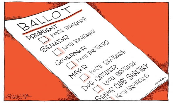 We don’t tell syndicated cartoonists what to draw, and what they draw is usually based on big news stories. The Koch brothers announcing (already!) that they plan to spend $900 million on the 2016 elections was big news. George Soros making a much-smaller contribution to a California proposition race or commenting on the euro zone was not (except in California and the euro zone).