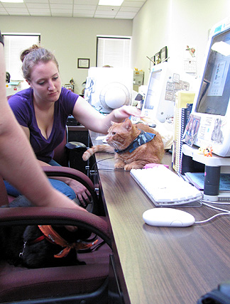 • I wish our paper actually did it. We occasionally have feline and canine visitors (like the cats from the School for the Deaf library in that last pic), but none on a regular basis … that may be one reason I have cats of all sorts all over my office in addition to the pictures of Luke.