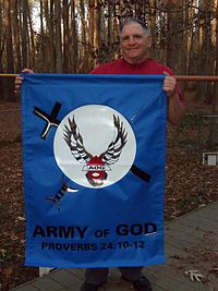 Spokesman Donald Spitz holds an Army of God banner. Eric Rudolph must be so proud.