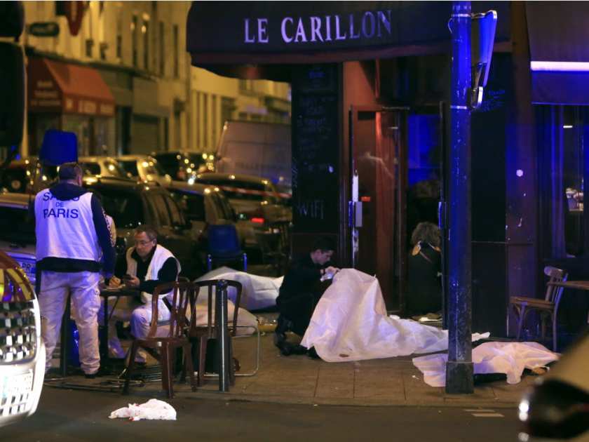 Victims lay on the pavement outside a Paris restaurant as police officials in France on Friday report multiple terror incidents, leaving many dead.