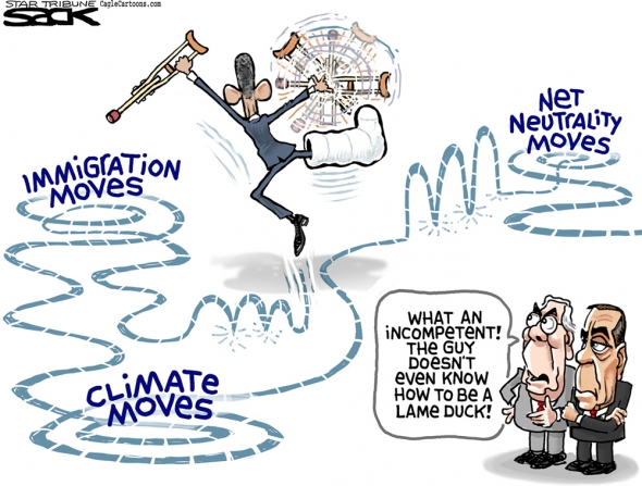How dare a president try to accomplish anything in his last term! Editorial cartoon by Steve Sack, Minneapolis Star-Tribune.