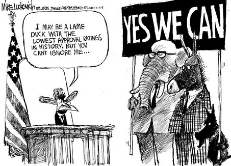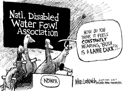 Yea! Proper use (shortly after the 2008 election) of the lame duck idea! Editorial cartoon by Mike Luckovich, Atlanta Journal-Constitution.