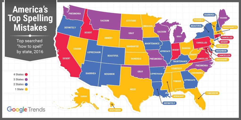One could float all sorts of theories about why some states have trouble with certain words (like why does Florida, home of Disney World and its Tomorrowland attraction, seem to be unsure of how to spell “tomorrow”?), but it’s all just speculation.