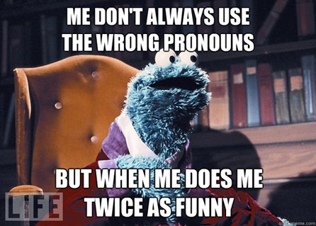 “I” and “me” aren’t the only pronouns that get misused, but I have little doubt they’re the most abused. Subject pronouns “he,” “she,” “we” and “they” and object pronouns “him,” “her,” “us” and “them” are often misused as well, but don’t get nearly the attention the others do in a world where it’s all about “I” and “me.” Don’t even get me started on “who” and “whom” … no, really … I mean that. That way lies annoyance and aneurysms. Bonus points, by the way, for anyone who noticed “you” and “it” missing from the list of subjective and objective pronouns. Since they’re the same form either way, there’s really no need to mention them. Other than this, obviously.