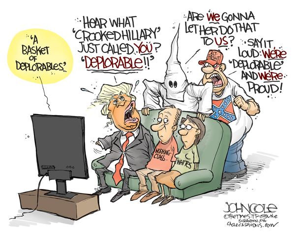 The rest of the story means nothing. That whole other basket means less than nothing: “[T]hat other basket of people are people who feel that the government has let them down, the economy has let them down, nobody cares about them, nobody worries about what happens to their lives and their futures, and they’re just desperate for change. It doesn’t really even matter where it comes from. They don’t buy everything he says, but he seems to hold out some hope that their lives will be different. They won’t wake up and see their jobs disappear, lose a kid to heroin, feel like they’re in a dead-end. Those are people we have to understand and empathize with as well.”