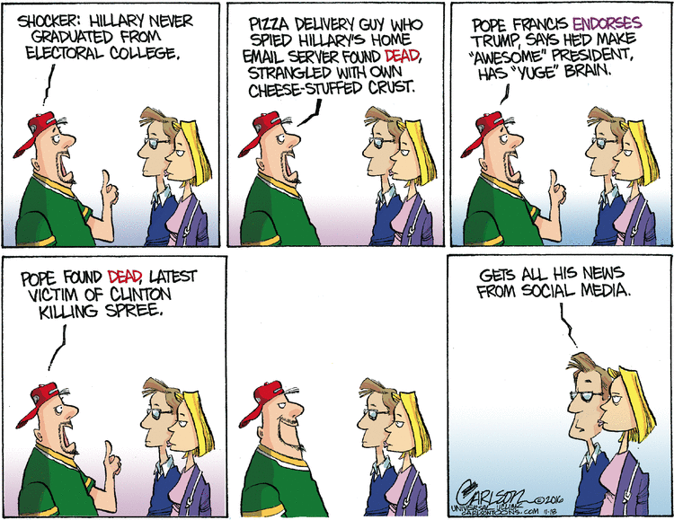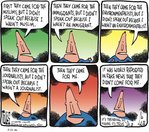 But responsible news sources verify facts before publication. (Yes, there are legitimate alternative sources that do just that, but there aren’t enough that do.) As the Chicago Tribune’s Rex Huppke wrote: “[Y]ou won’t read a story on a newspaper website or watch a news segment on television that is fabricated. You may not like what it says, but your opinion doesn’t override reality. When people lazily trust fake news that serves only to affirm their world-view, they disconnect from the real world. That can feel nice, but it leads us all down a rather dark path.”