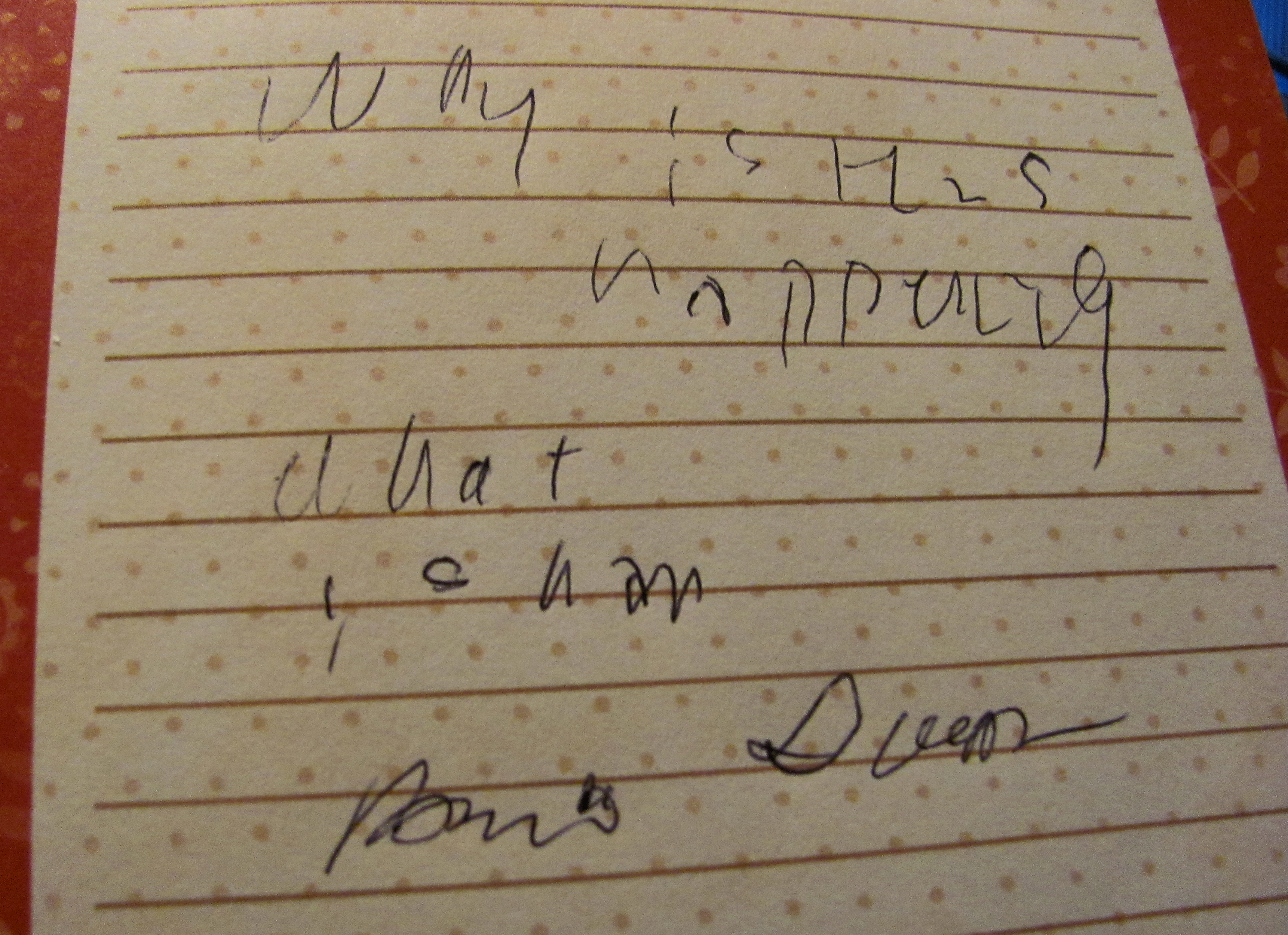 What I tried to write that day. I wrote better than that when I was 5. I think that last bit was supposed to be my signature.