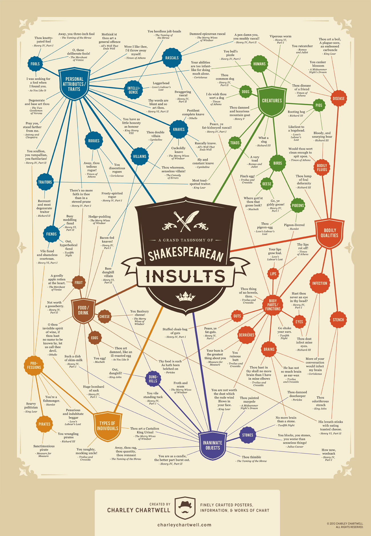 William Shakespeare, whether in comedies or tragedies, employed many insults, some blatant (“Thou art a boil, a plague sore, an embossed carbuncle in my corrupted blood.”—King Lear) and some not so much (“I do desire we may be better strangers.”—As You Like It). The beauty of many of them is that at first they might not seem insulting at all … until the insultees start thinking about them, assuming they aren’t “heedless jolt-heads” (The Taming of the Shrew). If nothing else, it’ll shut ’em up for a little while.