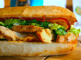My first thought was “What kind of bread roll is that? Ooh, maybe cheese bread with asiago baked in …” followed quickly by “A hero sandwich sounds kinda good right now. With grilled chicken.”