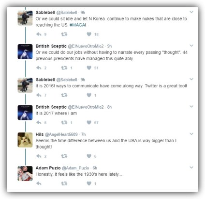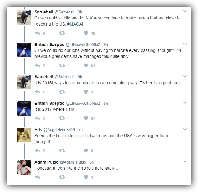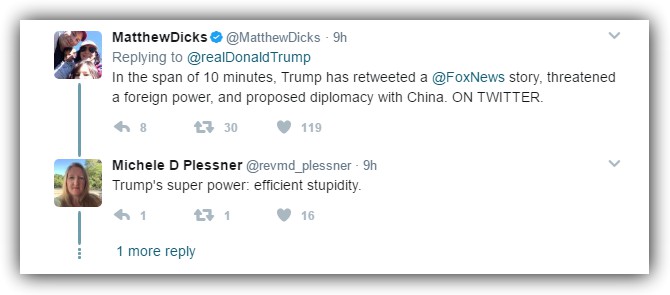 OK, I couldn’t close without a shoutout to some people who executed masterful burns on Twitter. Two exchanges really caught my eye while checking the Trump Twitter feed on Tuesday (I’m sick and I need help). I say bravo to these wits.