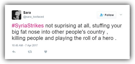 When I read @sara_toofaced’s tweet, I tried really hard not to laugh, but being a word nerd made that impossible: “#SyriaStrikes not suprising [sic] at all, stuffing your big fat nose into other people’s country, killing people and playing the roll of a hero.”