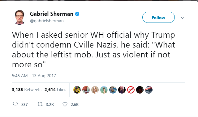 Dan Zak wrote in the Washington Post of the whataboutism used in the odd press conference the Tuesday after the death of Heather Heyer in Charlottesville: “For a nanosecond, especially to an uncritical listener, this stab at logic might seem interesting, even thought-provoking, and that’s why it’s a useful political tool. Whataboutism appears to broaden context, to offer a counterpoint, when really it’s diverting blame, muddying the waters and confusing the hell out of rational listeners.”