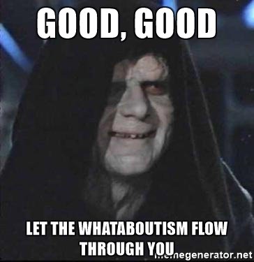 Whataboutism has become the go-to, it seems, for members of the current U.S. administration, often used to absurd lengths, though quite often with the same players (because it’s always someone else at fault … but Sarah, whoever did your makeup for the Tuesday press briefing/daily denial was definitely at fault for making you look like Elvira). Just a few minutes on the president’s Twitter page is enough to see his deep, abiding obsession with all things Obama and Clinton.