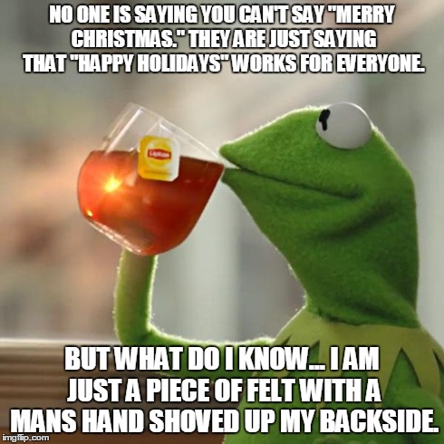 What some seem to take exception to (and thus decide that it’s an infringement of their rights even though it’s not) is that many of us recognize that other holidays from other faiths (or lack of) are celebrated at this time of year and, because we don’t wear signs to tell everyone what we believe, we tell those we don’t know “happy holidays.” It makes sense, is a nod to those other holidays, and has been in use here for at least 100 years. (And hey, “holiday” comes from the Old English word for “holy day”—“halidaeg.”)