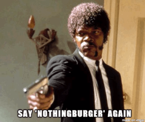 But “fake news” wasn’t the only thing related to the Trump administration that appeared on the list this time. (No, weirdly, “believe me” and “that I can tell you” didn’t make the cut.) “Nothingburger,” uttered by former chief of staff Reince Priebus to describe a meeting between Donald Trump and Russians, now has been overused by so many hyperpartisans in response to any allegation involving the administration that I’m sure even those hyperpartisans are sick of it. And when so much is dismissed because “no evidence” has been released, it shows that these people have no concept of how investigations work. Where’s the beef? Wait for it …