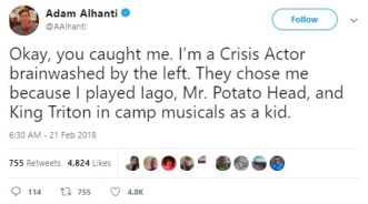 On the other hand, Adam Alhanti did tweet, “OK, you caught me. I’m a crisis actor brainwashed by the left. They chose me because I played Iago, Mr. Potato Head and King Triton in camp musicals as a kid.”