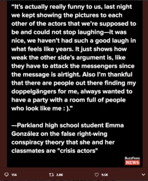 Since the day of the shooting, conspiracy theories have abounded (partly thanks to Russian trolls, according to PolitiFact), one of the insidious of which is that the most outspoken of the students—among them David Hogg, Emma Gonzalez and Cameron Kasky—are “crisis actors” and that the shooting was set up by the CIA, FBI or any number of other “evil” entities.