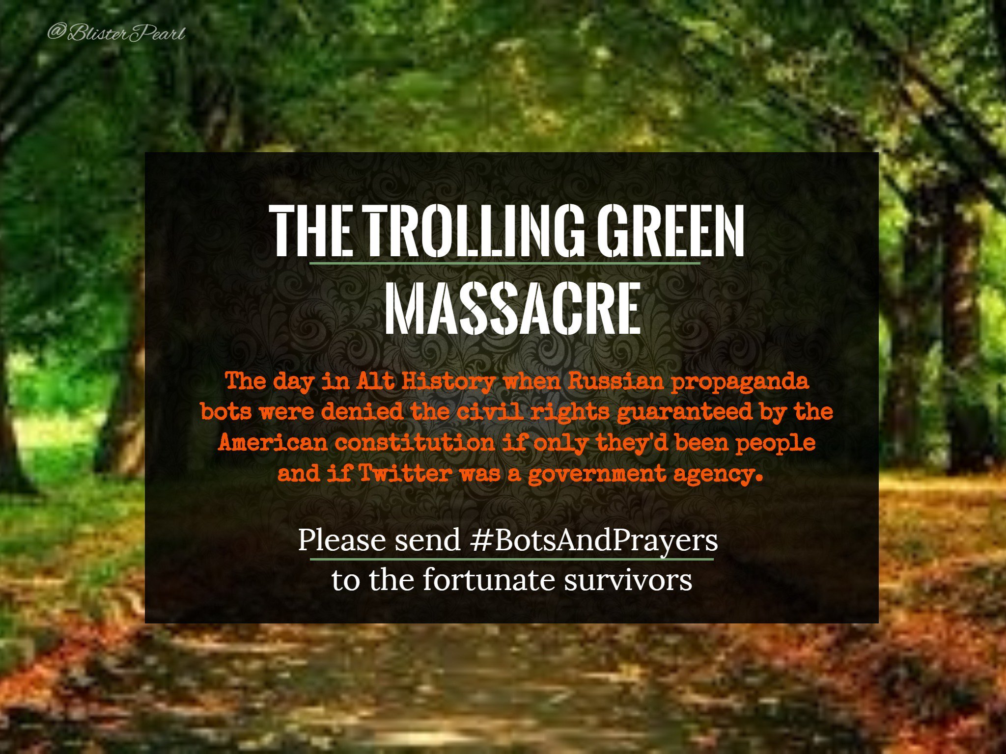 Meanwhile, let’s bow our heads in remembrance of those trolls/bots that lost their Twitter accounts (though some no long enough) in the recent Twitter lockout, now known by some as the Trolling Green Massacre. My heart bleeds for them … oh, no, wait, that’s my ice cream melting.
