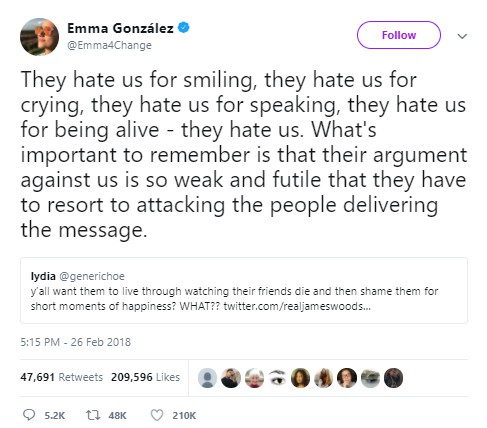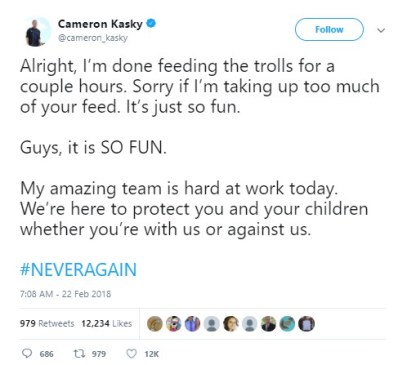 It hasn’t all been laughs for the kids, though their ability to maintain a sense of humor after so much vitriol has been aimed at them speaks well for their collective mental strength. Between mourning lost classmates and teachers, and fighting for their newfound cause, some have faced threats.