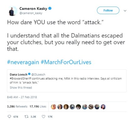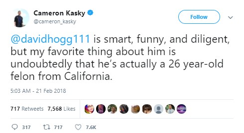 And Cameron Kasky (perhaps the biggest cut-up of the group if his Twitter timeline is any indication) tweeted that Hogg “is smart, funny and diligent, but my favorite thing about him is undoubtedly that he’s actually a 26-year-old felon from California.”