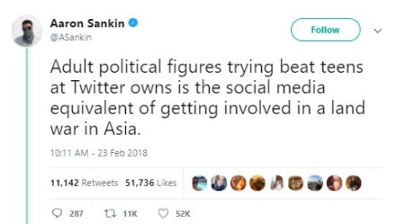 I said last week that the Parkland students are part of a media-savvy generation, one that’s grown up totally in a post-Columbine world, and social-media platforms like Facebook and Twitter have been around for the bulk of their young lives. Their command of social media is just one reason their movement became so big so quickly.