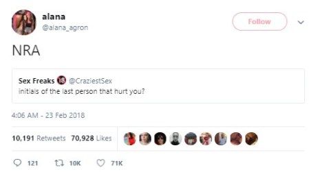 Gonzalez (whose shaved head, by the way, isn’t so much a political statement, she says, as it is more a statement on how hot Florida can get, especially if you have long hair) told BuzzFeed of the “crisis actor” rumors: “I’m thankful that there are people out there finding my doppelgangers for me; always wanted to have a party with a room full of people who look like me.” Gonzalez, who started her @Emma4Change Twitter account a couple of days after the shooting, now has more followers than the NRA. I have no idea how many of those followers might also be doppelgangers, but they seem to appreciate her activism and sense of humor.