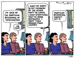 It’s hard to explain just how sick I am of the rabid partisanship we’ve been seeing lately. It would be much easier to talk about the cold from hell that I’ve been dealing with (though it might not pass the breakfast test; colds are, by nature, phleghmy). And that’s even taking into account all the pauses to catch my breath (don’t ya love it when a cold settles in your lungs?) and the waiting for the side effects of my medications to pass.
