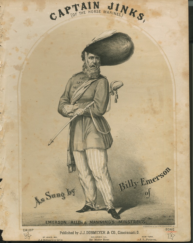 Etymologist Barry Popik suggests instead that it could have come from “Captain Jinks of the Horse Marines,” an American vaudeville song in the 1860s about a buffoonish, unsuccessful soldier, which soon became a barroom staple. The character later appeared in a play starring Ethel Barrymore, and in a satiric novel. According to Wordorigins.org, Popik and Gerald Cohen also found a spoof of Edgar Allan Poe’s “The Raven” called “More Copy,” published in 1859 in The Printer, with the character of “Jinks” in place of the raven, acting as a messenger between an editor and reporter: