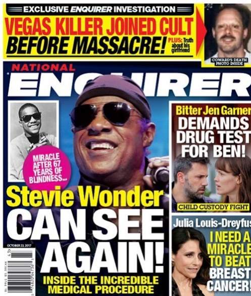 Wonder (who turns 68 on Sunday) has been blind since shortly after his premature birth; the oxygen therapy used on him resulted in retinopathy of prematurity, leading to detached retinas, permanently blinding him. And despite the National Enquirer’s cover story in October, no, he hasn’t had surgery to restore his vision (wait … if he’s not blind, why would he need …). Sure, he’s joked about being able to see, but that’s all it was—a joke. The friar would likely agree that the simplest explanation here is that Wonder hasn’t been faking blindness for nearly 68 years … and that he has a puckish sense of humor (I knew there was another reason to like him).