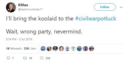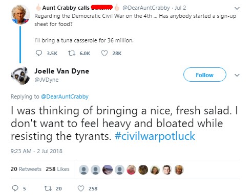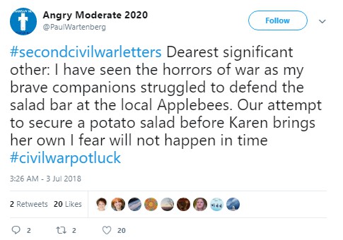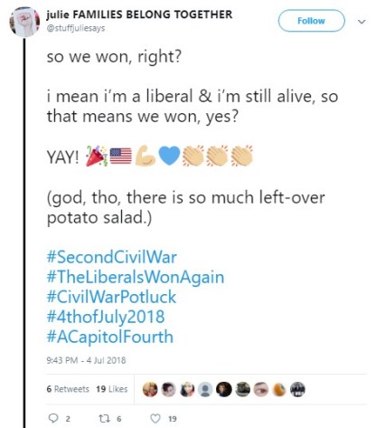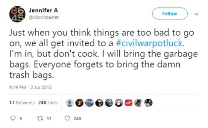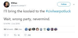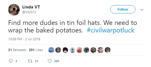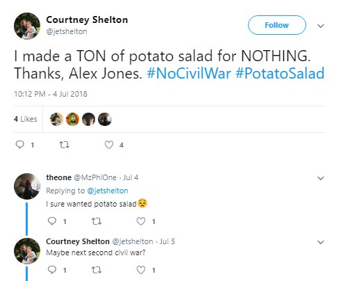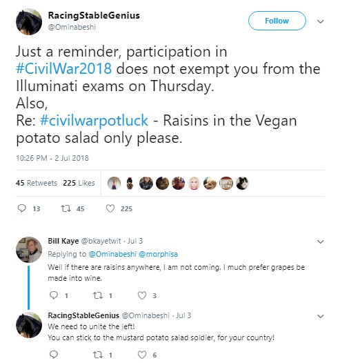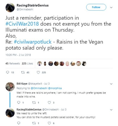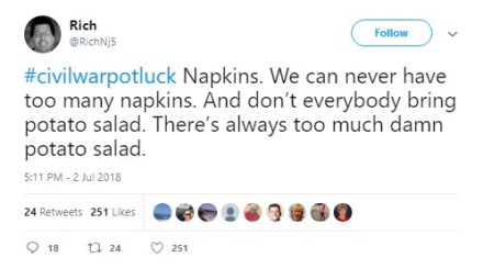 Raisins??? That should be a capital offense … what a waste of good potatoes. I’m hoping it wasn’t Kathryn J. Mullee, who tweeted: “I’m so disappointed in this #secondcivilwar. I made enough potato salad for 35 million people.” RacingStableGenius, though, advocated raisins … but only in the vegan potato salad.