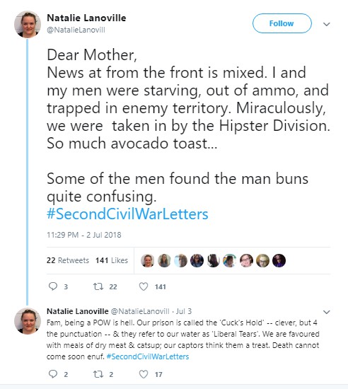 Natalie Lanoville wrote: “News … from the front is mixed. I and my men were starving, out of ammo, and trapped in enemy territory. Miraculously, we were taken in by the Hipster Division. So much avocado toast …”