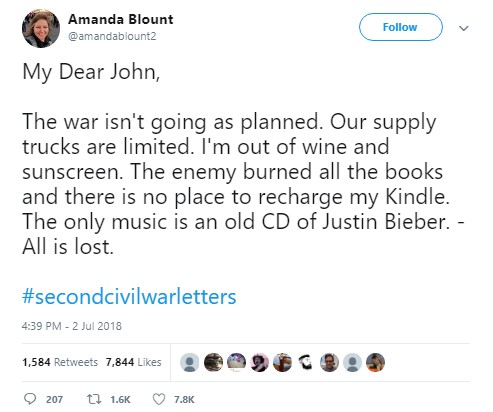 Amanda Blount tweeted: “My Dear John, The war isn’t going as planned. Our supply trucks are limited. I’m out of wine and sunscreen. The enemy burned all the books and there is no place to recharge my Kindle. The only music is an old CD of Justin Bieber. All is lost.”