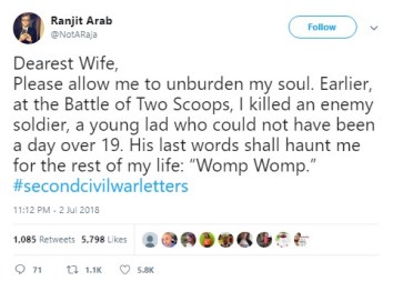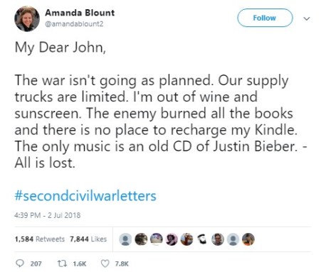 The Biebs? Really? Life is just not fair. Regardless, Blount’s tweet inspired others to compose their own mock letters. Soon, #SecondCivilWar and #SecondCivilWarLetters started trending. The messages were largely light and humorous, sometimes dipping into the political, but not usually.