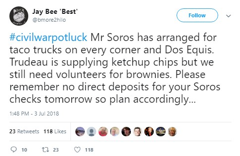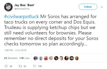 But within a couple of days rumors started of a Democratic coup planned as part of immigration protests. Either that’s wrong, or these people have full-time event planners on their staff and a lot of excess time and energy (yeah, I’m lucky if I have time and energy to shower some days). Many Second Civil War vets echoed @ProudVirginian, who tweeted: “OK fine, but I’m not putting on that civil war uniform again. It was too hot and the belt didn’t match. I’m wearing my shorts for coup. Also, I’m going to sleep in a bit, so let’s start the coup at around noon.”