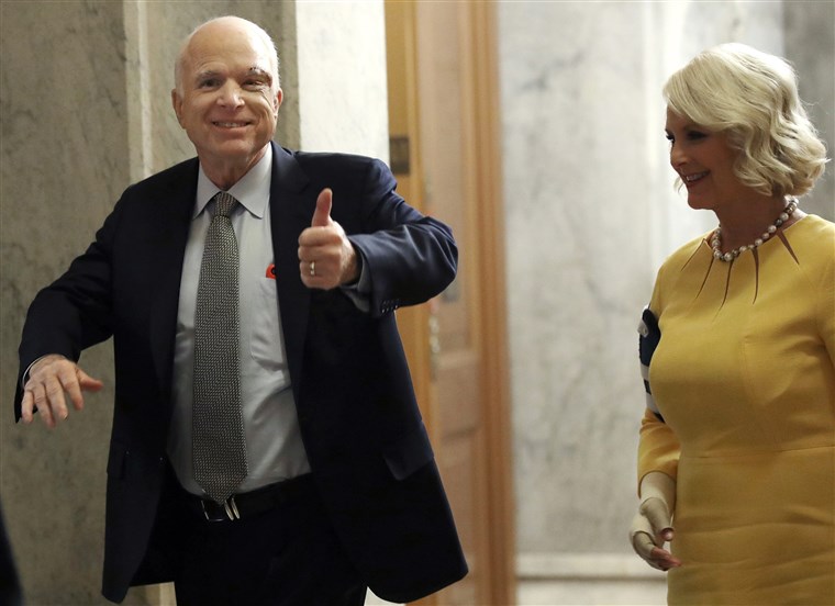 McCain gives a thumbs-up at the Capitol as wife Cindy follows him on his return to the Senate floor.