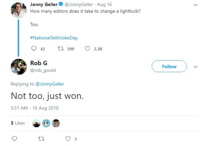 Thursday was National Tell A Joke Day, and I missed it, dang it. But this tweet (and its best response) convinced me I should extend it to today … with the caveat that it be an editing joke.