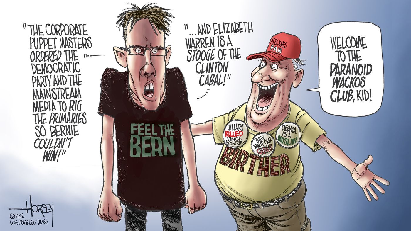 Editorial cartoon by David Horsey, Los Angeles Times.“[T]he idea of the paranoid style as a force in politics would have little contemporary relevance or historical value if it were applied only to men with profoundly disturbed minds. It is the use of paranoid modes of expression by more or less normal people that makes the phenomenon significant. Of course this term is pejorative, and it is meant to be; the paranoid style has a greater affinity for bad causes than good.”
