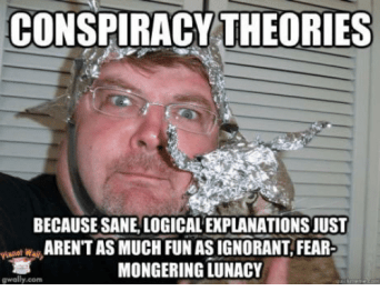Ultimately, belief in conspiracy theories comes down to fear—that we have no control over our lives, or that enemies are all around us, for example. In disseminating such theories, we sell fear so that others will be just as frightened as we are. Misery does love company.