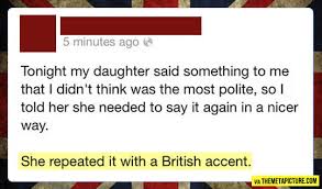 No, being polite doesn’t mean speaking in a British accent. Just like us, some Brits are wankers.