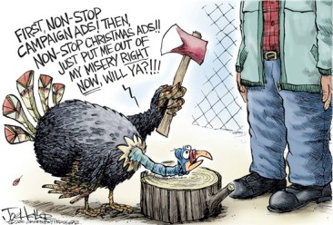 Like Crazy Cousin Earl, I’m thankful that the political emails have slowed to a trickle … well, at least in my personal email. In my work email I’m still getting many, many press releases from this and that elected official. Can I just wish them all away? Does anyone have a spare wishbone I can wish on? The ham I’m having for Thanksgiving is sans wishbone. Dang it. And now I remember I need to take that thing out of the freezer. So much ice …