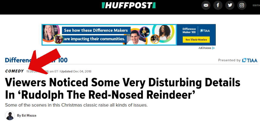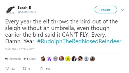 But make jokes about it—such as @SarahB1863’s tweet, “Every year the elf throws the bird out of the sleigh without an umbrella, even though earlier the bird said it CAN’T FLY. Every. Damn. Year.”—that makes it into a collection of funny tweets about Rudolph posted in the (clearly labeled) comedy section of Huffington Post (evil bastion of liberalism that it is), and you have yourself a controversy.