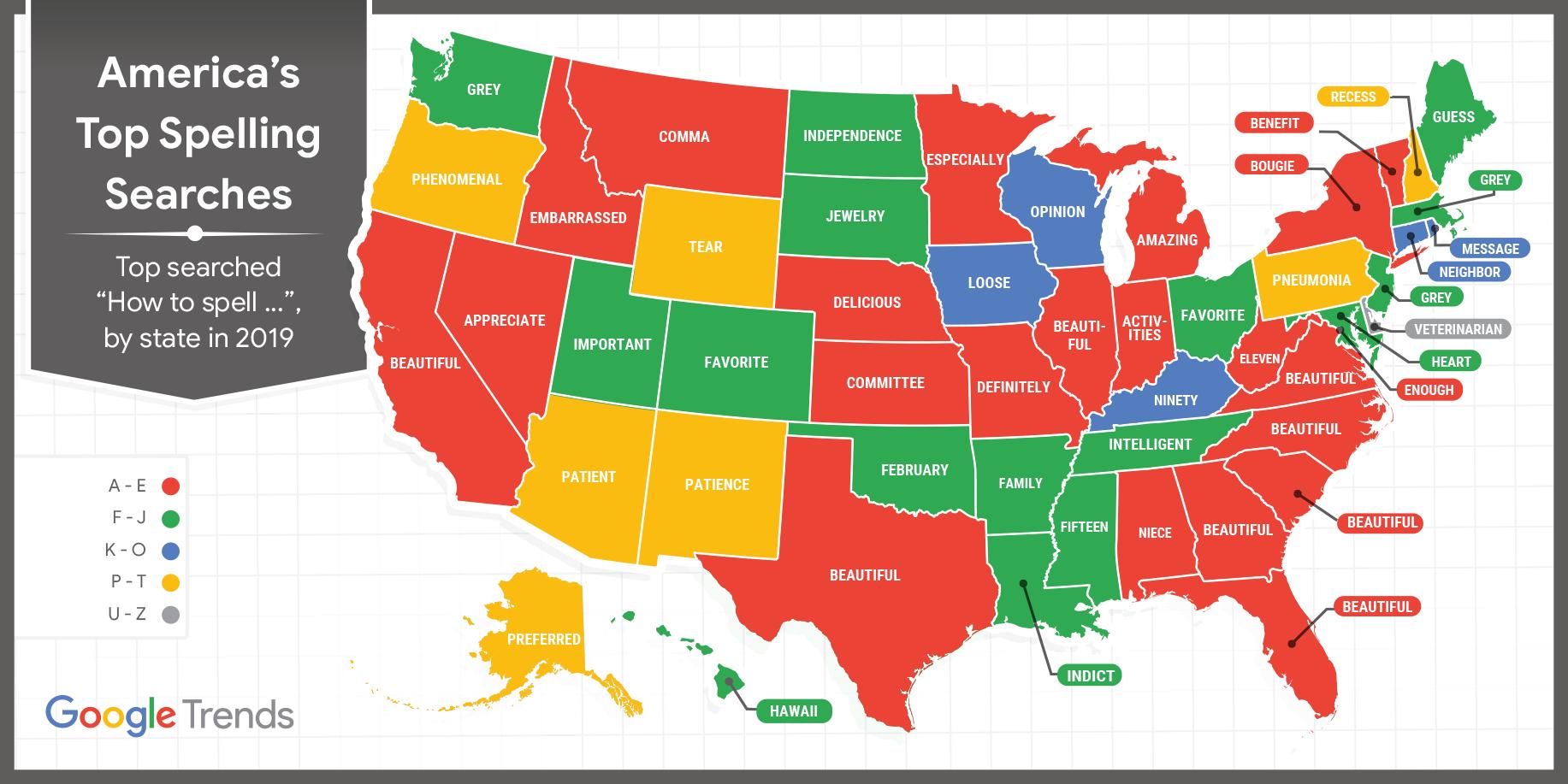 In advance of the Scripps National Spelling Bee, going on now, Google Trends released its list of the words residents of each state looked up the most on Google using the phrase “how to spell.” Google’s probably missing out on a lot of those words, though, because I know of more than a few people who, like me, just type in the word to see what Google suggests for the spelling.
