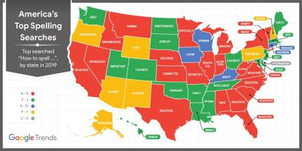 The last time I wrote about the Google Trends spelling list, in May 2016, Alaska had trouble with the name of its statehood partner, but this time the state with that “honor” was Hawaii (that’s embarrassing). Massachusetts residents had trouble with “Massachusetts” back in 2016, so now I’m wondering if perhaps some of those residents decided to retire to the islands. Massachusetts now has issues with “grey,” as do New Jersey and Washington state. Don’t tell them that we in newspapers use the American spelling, “gray.”