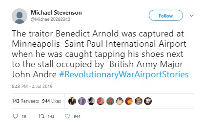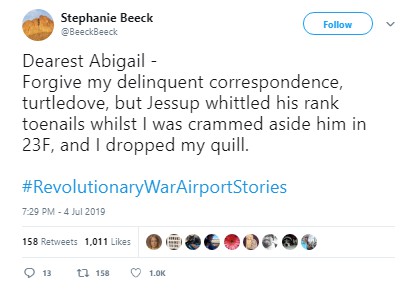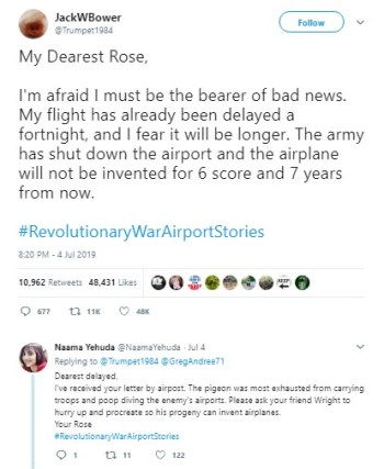 One of the beauties of viral Twitter jokes like #RevolutionaryWarAirportStories is that they just naturally come to an end when people sense that the concept’s gotten stale, usually after two or three days.
